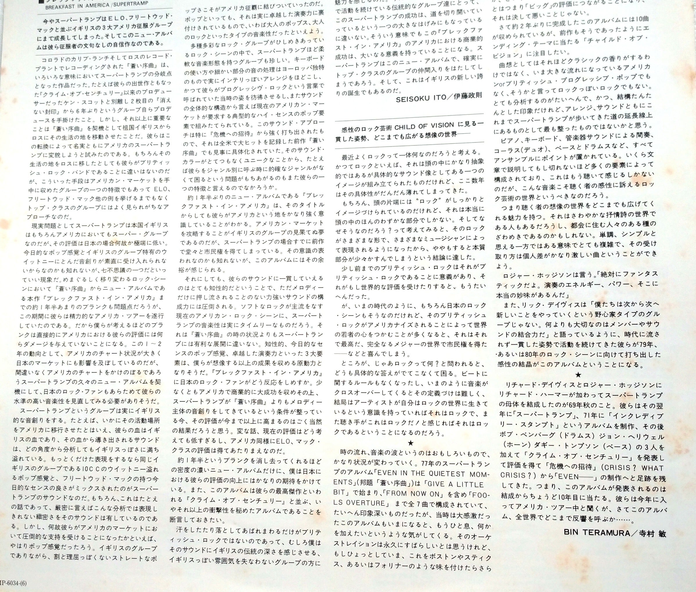 ス-パートランプ/ SUPERTRAMP / ブレックファスト ・イン・アメリカ / 中古 レコード / LP RECORD /AMP-6034